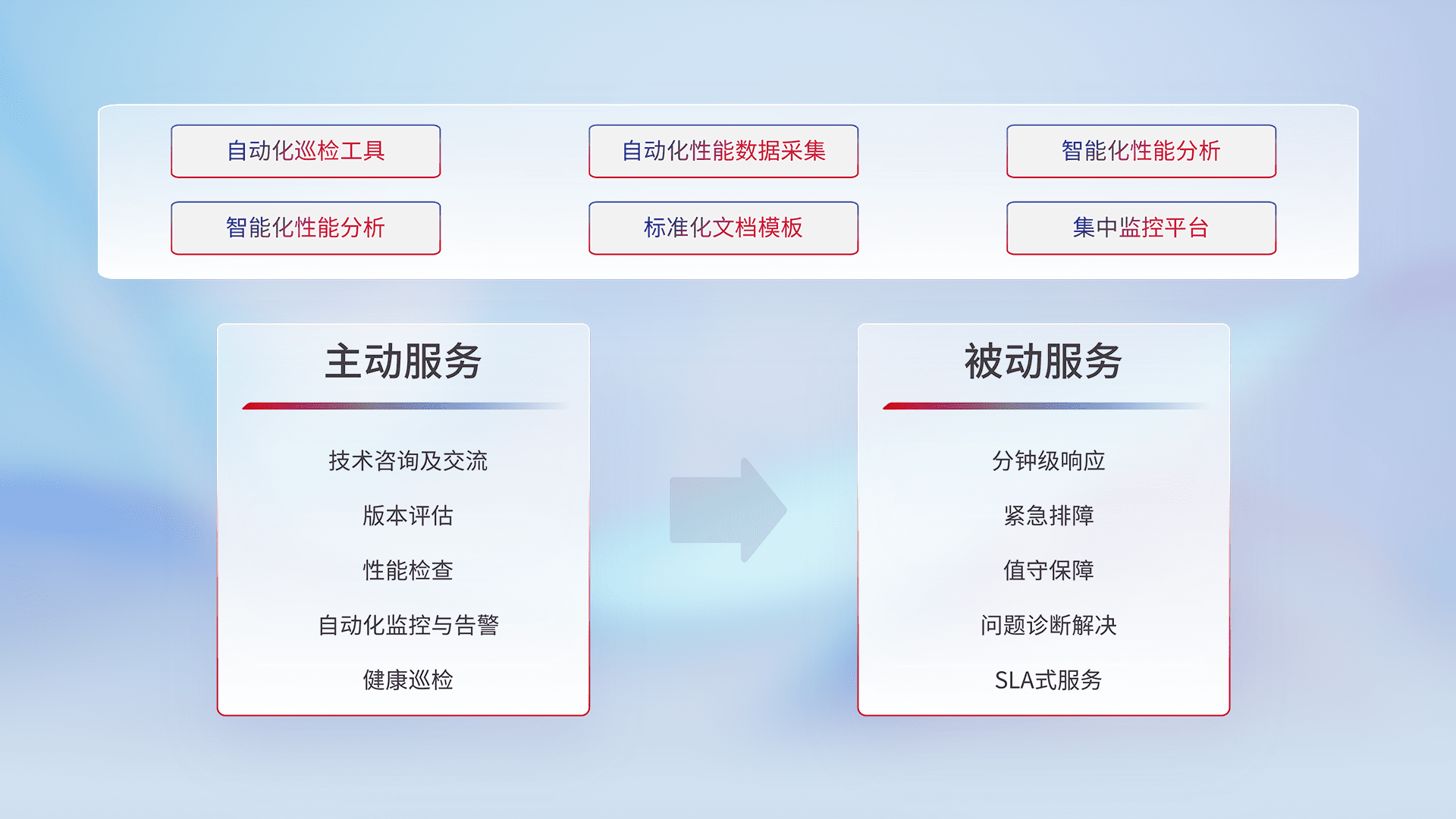 智能化工具和标准化文档,,,,保障服务质量,,,提供主动服务(包含技术咨询、、、、版本评估、、、性能检查、、、自动化监控与告警、、健康巡检)和被动服务包含(分钟级响应、、紧急排障、、、值守保障、、、、问题诊断解决、、、、SLA服务)。。。